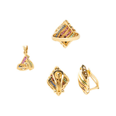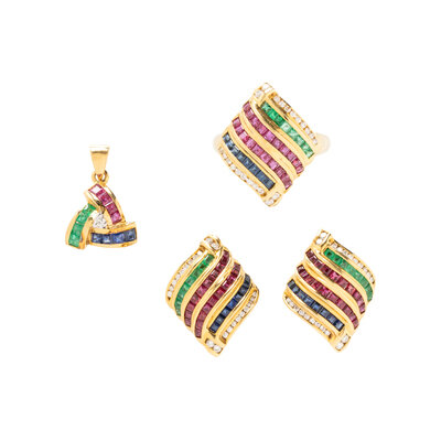Consisting of a ring, earrings with folding posts and clip backs, and a pendant, set with calibre cut rubies, sapphires and emeralds and round brilliant cut diamonds. 18 karat yellow gold. Ring size 7 1/4. Earrings: 7/8 inch long. Pendant: 3/4 inch long with bail.