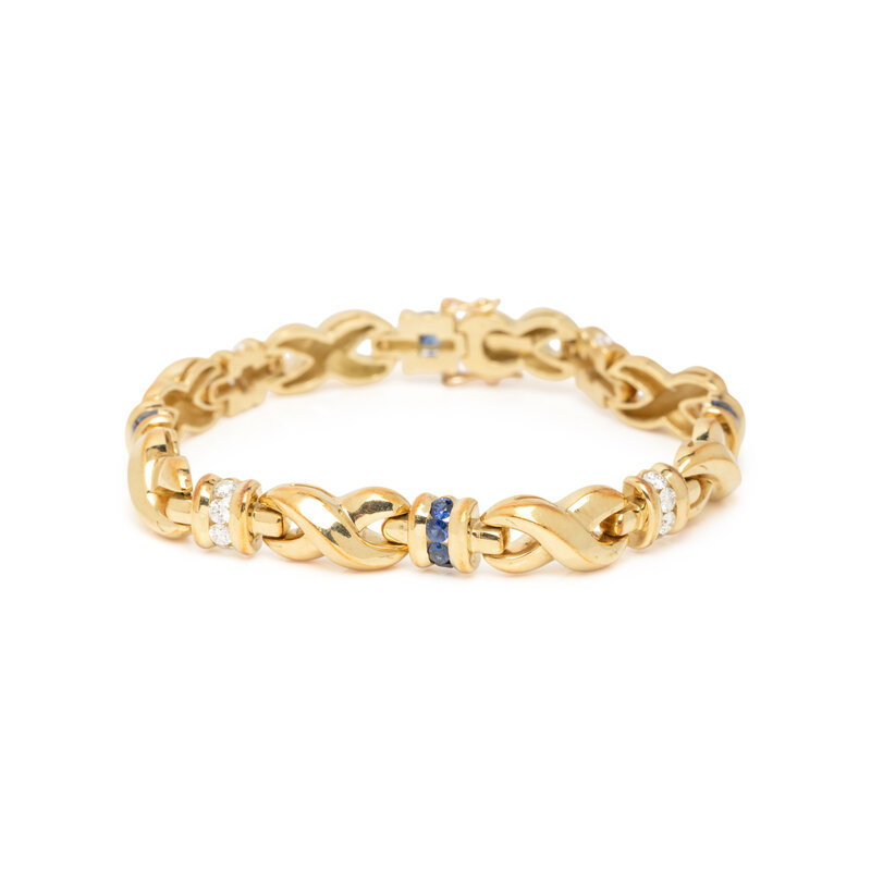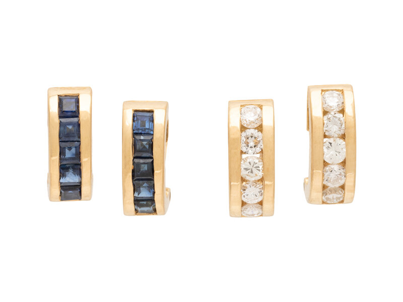 Consisting of a bracelet and two pairs of huggie clip earrings, set with round brilliant cut diamonds, and square step cut and round faceted sapphires. Yellow gold. Bracelet: 7 inches long. Huggies: 3/8 inch long.
