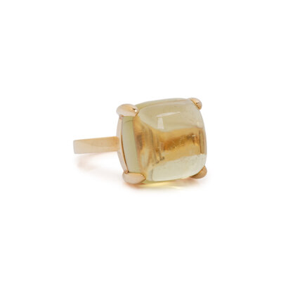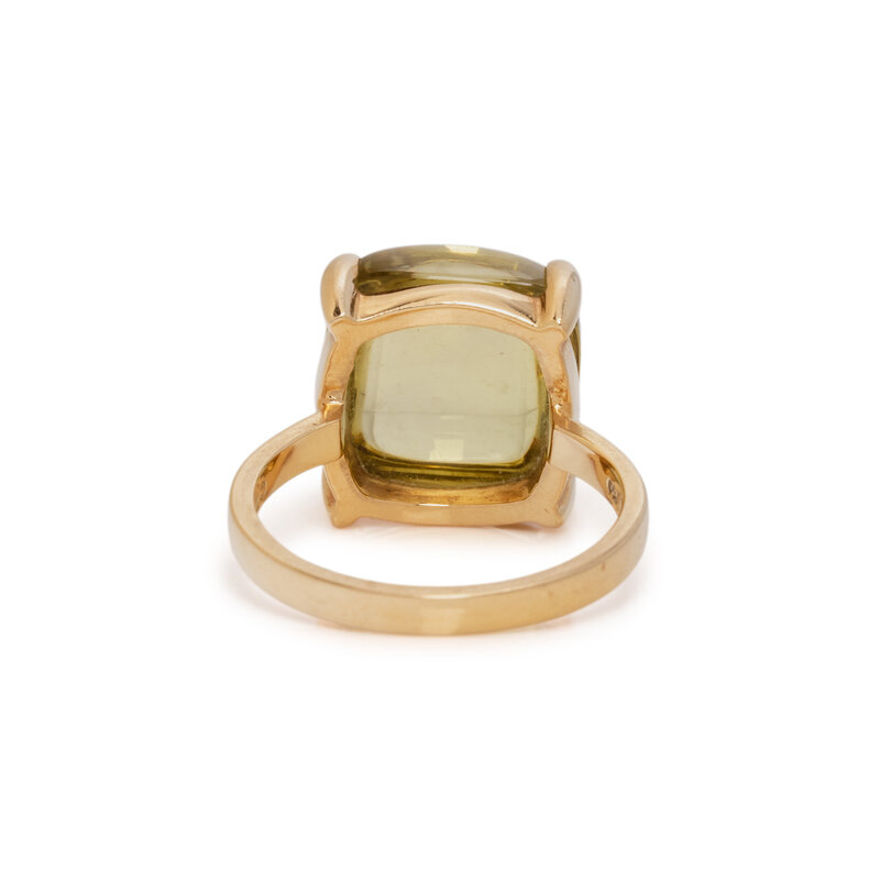 Cushion shaped cabochon prasiolite measuring approximately 12.00 x 12.00 x 8.20 mm. 18 karat yellow gold. Ring size 6.