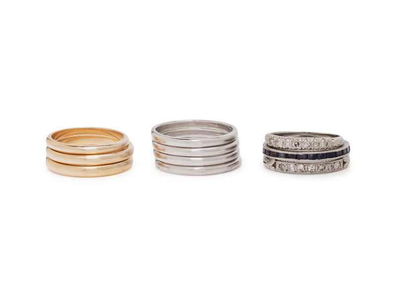 Including three yellow gold bands, four white gold bands, two white gold rings set with single and round brilliant cut diamonds, and a platinum band with rectangular step cut sapphires. Ring sizes 4 1/2 - 6 1/2.