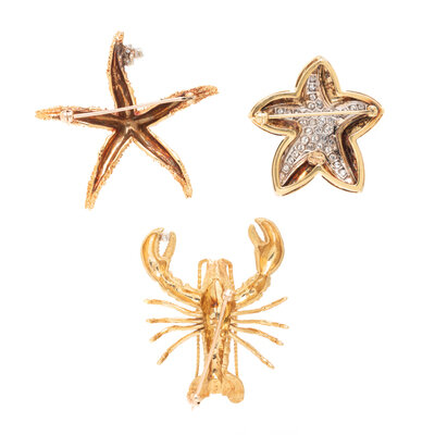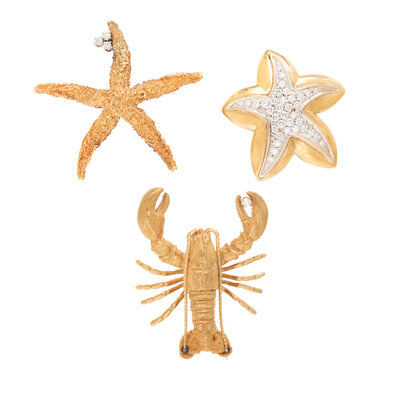 Including a lobster set with a round brilliant cut diamond weighing approximately 0.05 carat, a starfish set with three round brilliant cut diamonds weighing approximately 0.10 carat total, and a starfish pavé set with round brilliant cut diamonds weighing approximately 0.60 carat total. Yellow gold. 1 3/4 x 1 3/8 inches, 1 3/4 x 1 3/4 inches, and 1 3/8 x 1 1/4 inches.