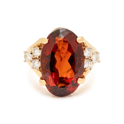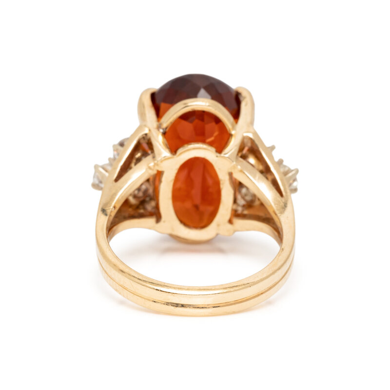 Oval faceted citrine measuring approximately 18.05 x 11.50 x 8.95 mm and round brilliant cut diamonds. 14 karat yellow gold. Ring size 6.