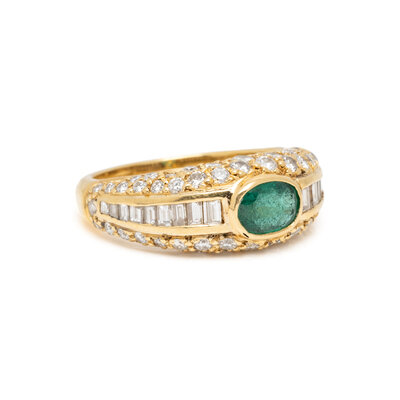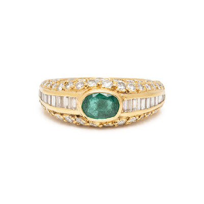 Oval faceted emerald measuring approximately 6.25 x 4.50 mm, round brilliant and baguette cut diamond weighing approximately 1.65 carats total. 18 karat yellow gold. Ring size 6.