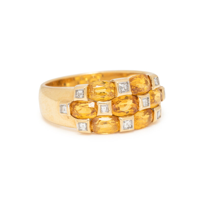 Oval faceted X measuring approximately 5.00 x 3.50 mm and square step cut diamonds. 18 karat yellow gold. Ring size 6 1/4.