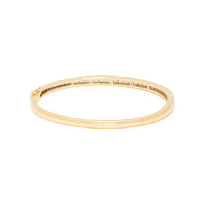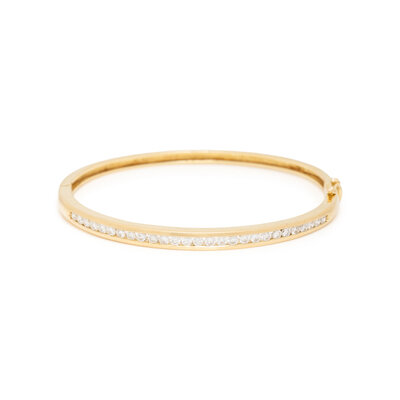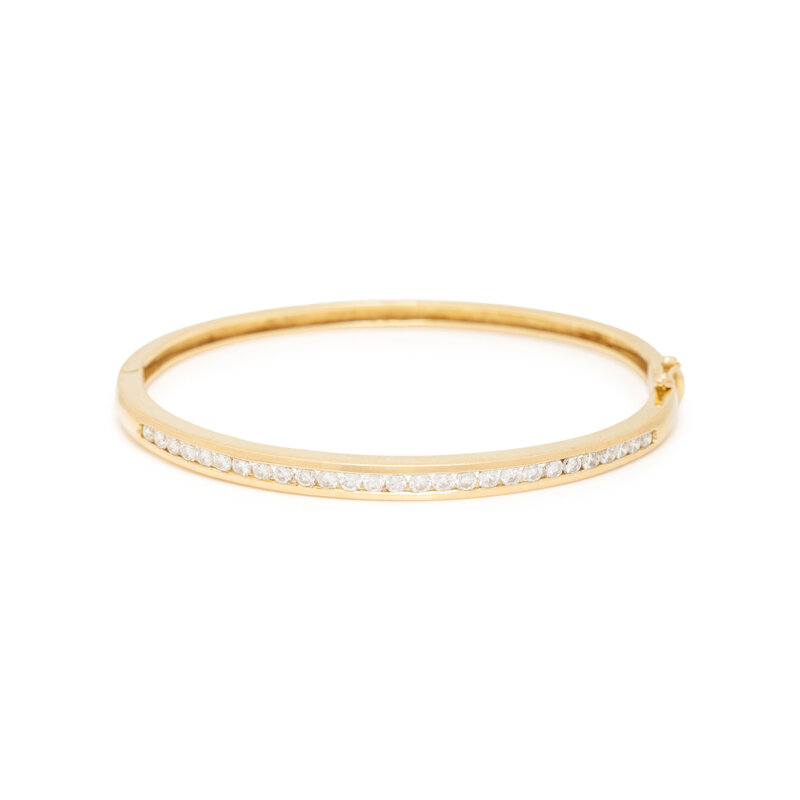 Round brilliant cut diamonds weighing approximately 1.20 carats total, hinged with side clasp. 18 karat yellow gold. 6 1/4 inches inner circumference.