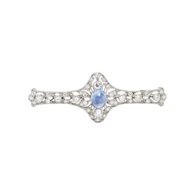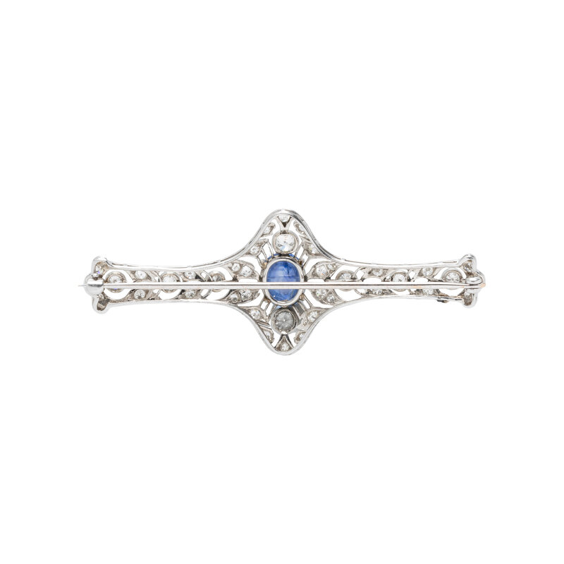Oval cabochon sapphire measuring approximately 9.15 x 7.75 x 6.60 mm, and transitional cut and single cut diamonds weighing approximately 1.70 carats total. Platinum. 2 5/8 x 1 inches.