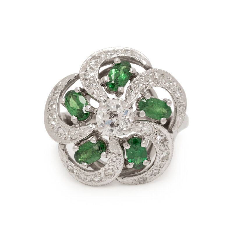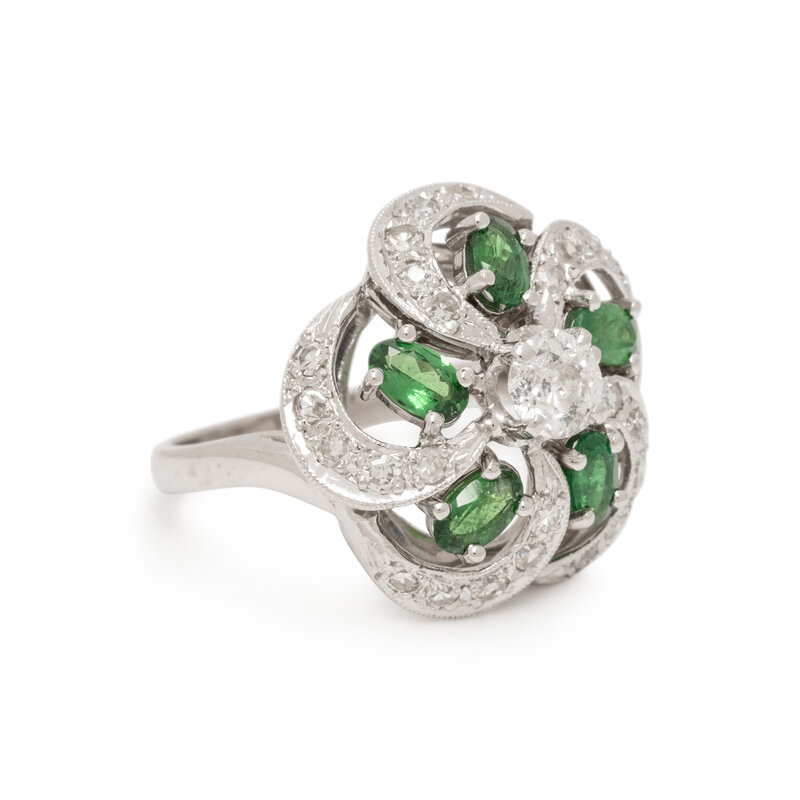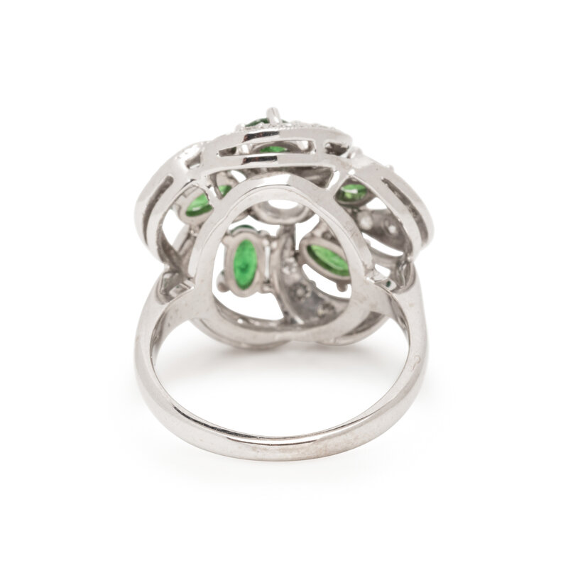 Old European cut diamond weighing approximately 0.45 carat, single and round brilliant cut diamonds weighing approximately 0.25 carat total, oval faceted tsavorite garnets measuring approximately 5.00 x 3.00 mm. 14 karat white gold. Ring size 6 3/4.