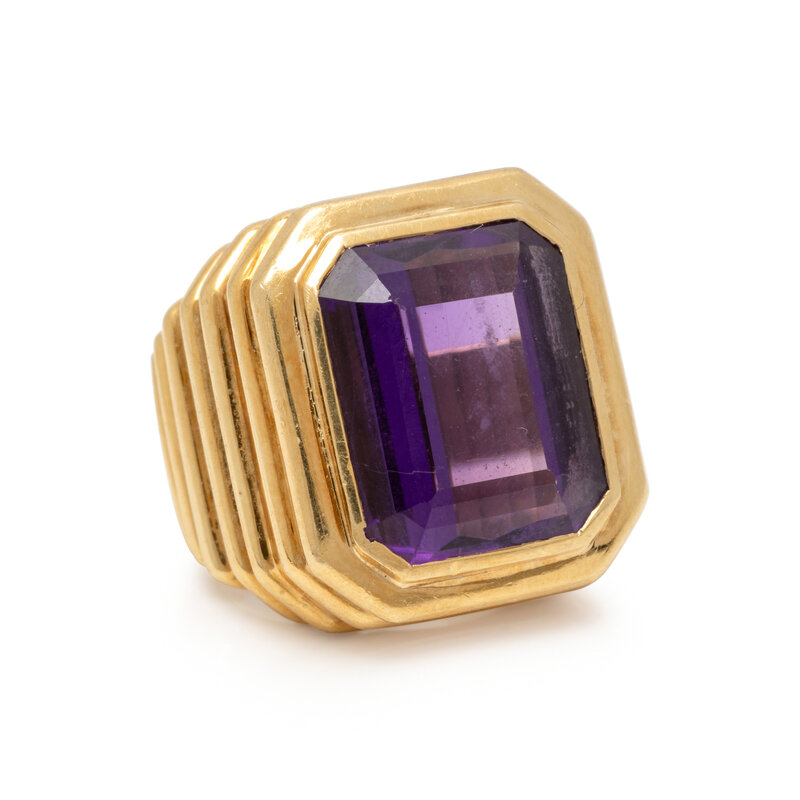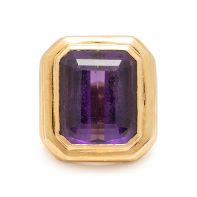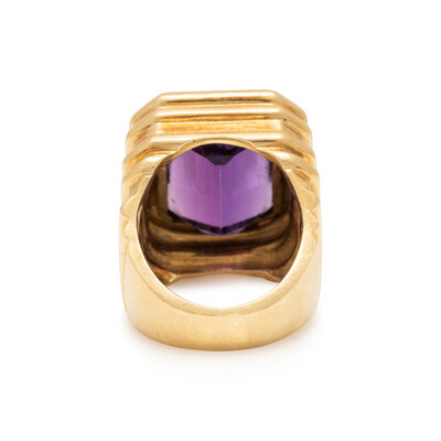 Rectangular step cut amethyst measuring approximately 16.50 x 13.50 x 9.50 mm. 18 karat yellow gold. Ring size 6 1/4.