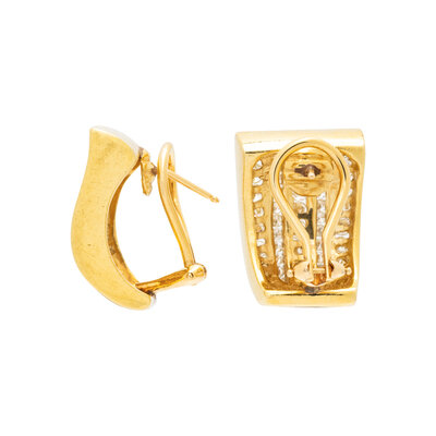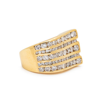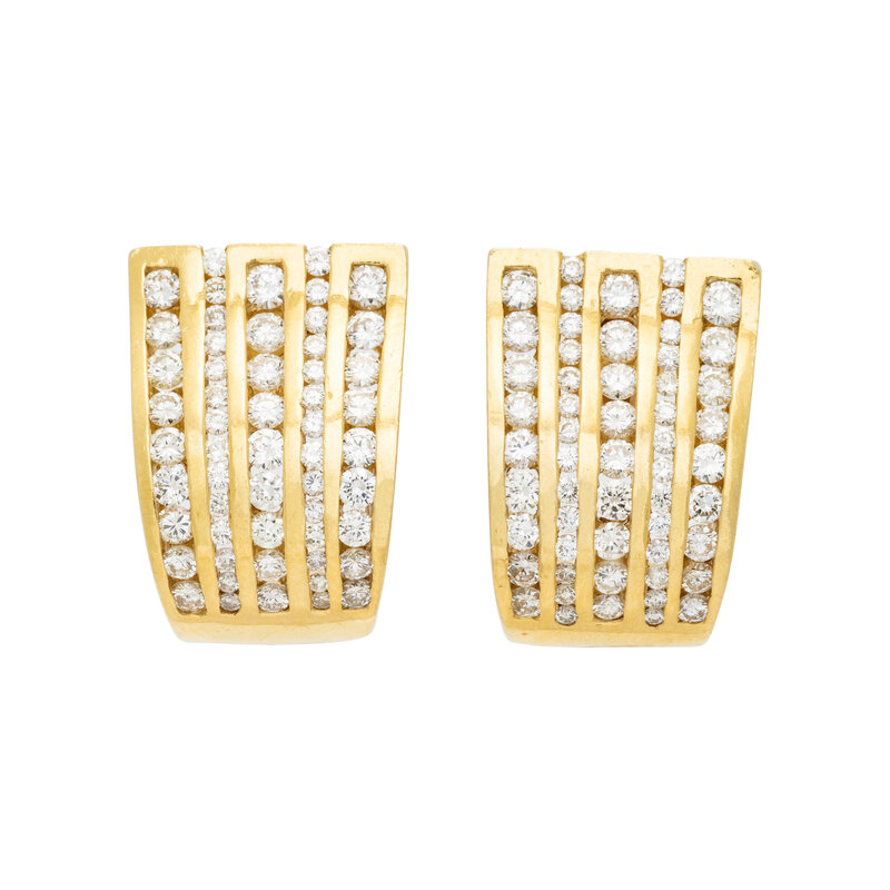 Channel set round brilliant cut diamonds weighing approximately 4.00 carats total. 18 karat yellow gold. Ring size 7. Earrings: 13/16 inch long.