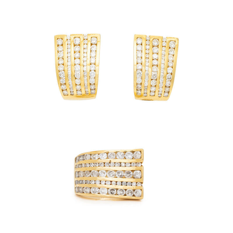 YELLOW GOLD AND DIAMOND RING AND EARRINGS