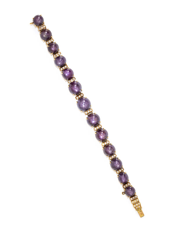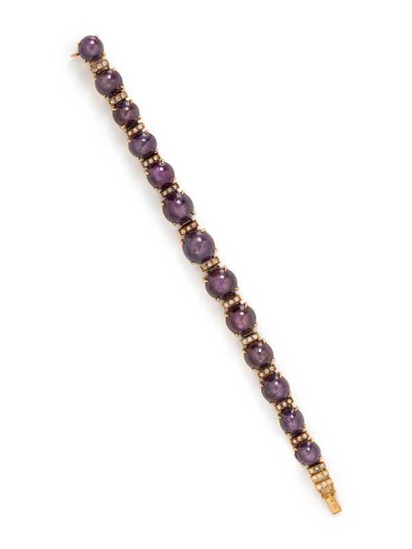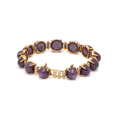 Oval cabochon star rubies measuring approximately 8.75-11.00 mm and round brilliant cut diamonds. Mounted in 14 karat yellow gold. 7 inches long.
