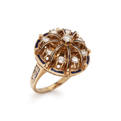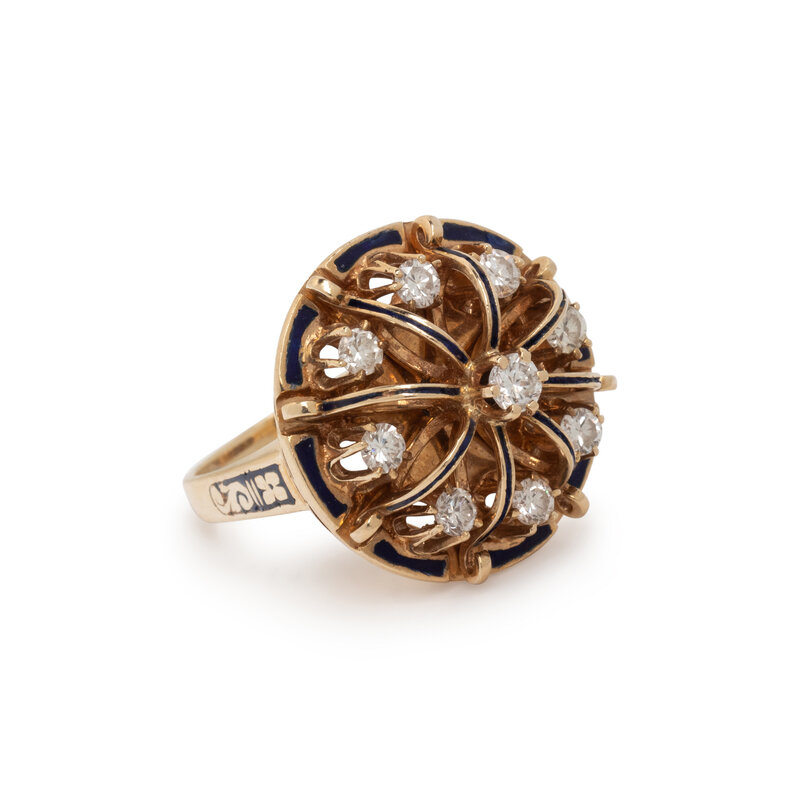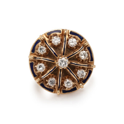 Round brilliant and transitional cut diamonds weighing approximately 0.80 carat total and blue enamel. 14 karat yellow gold. Ring size 7 1/2.