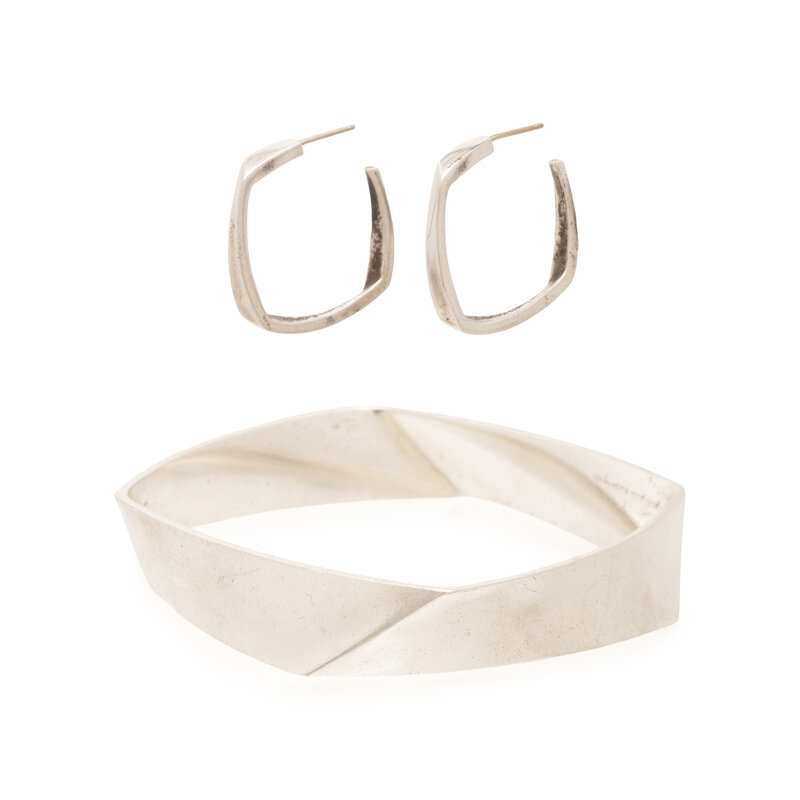 Sterling silver. Bangle: 7 1/2 inches inner circumference. Earrings: 1 inch long.