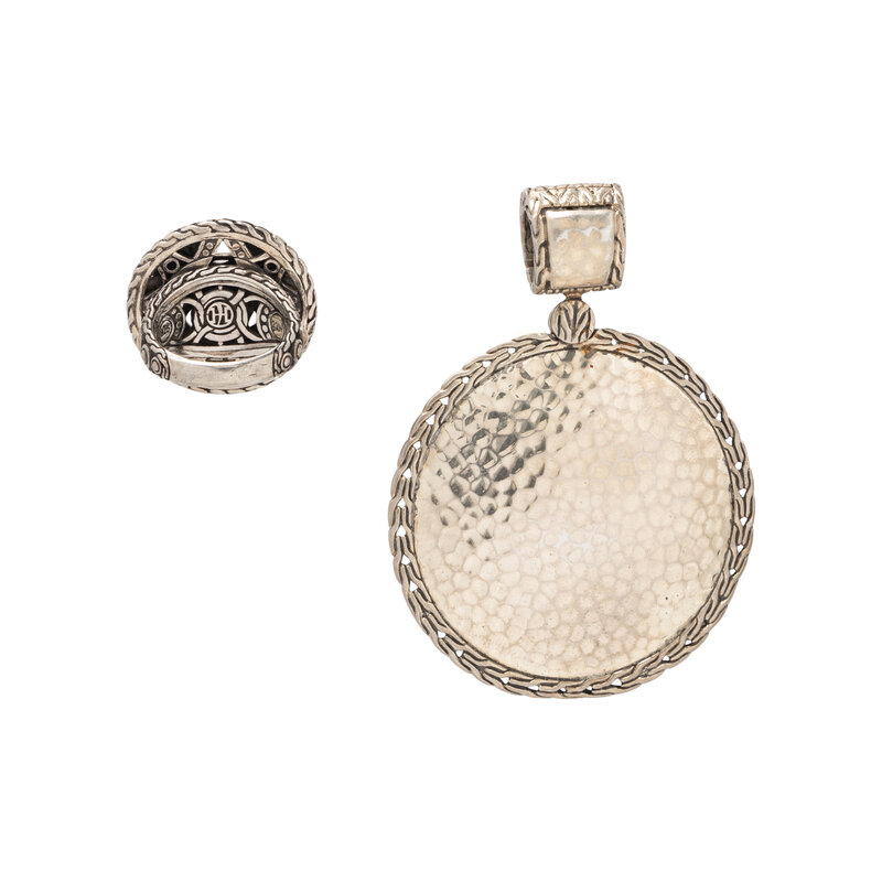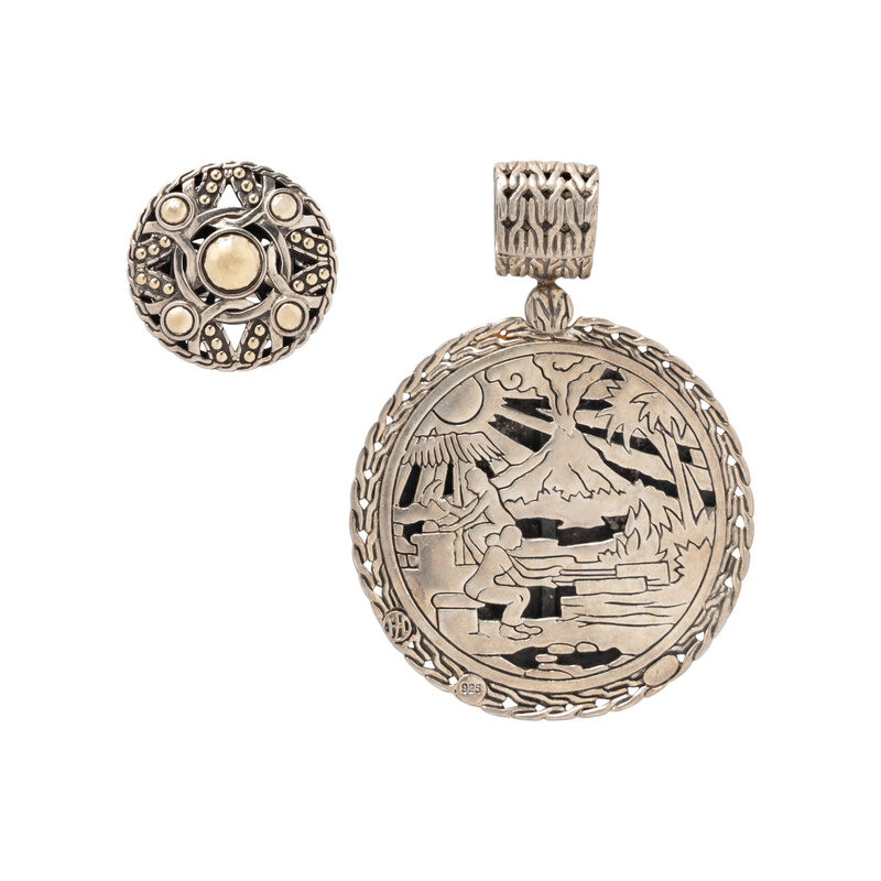 Sterling silver and 22 karat gold. Pendant: 2 inches wide. Ring size 7 1/4.