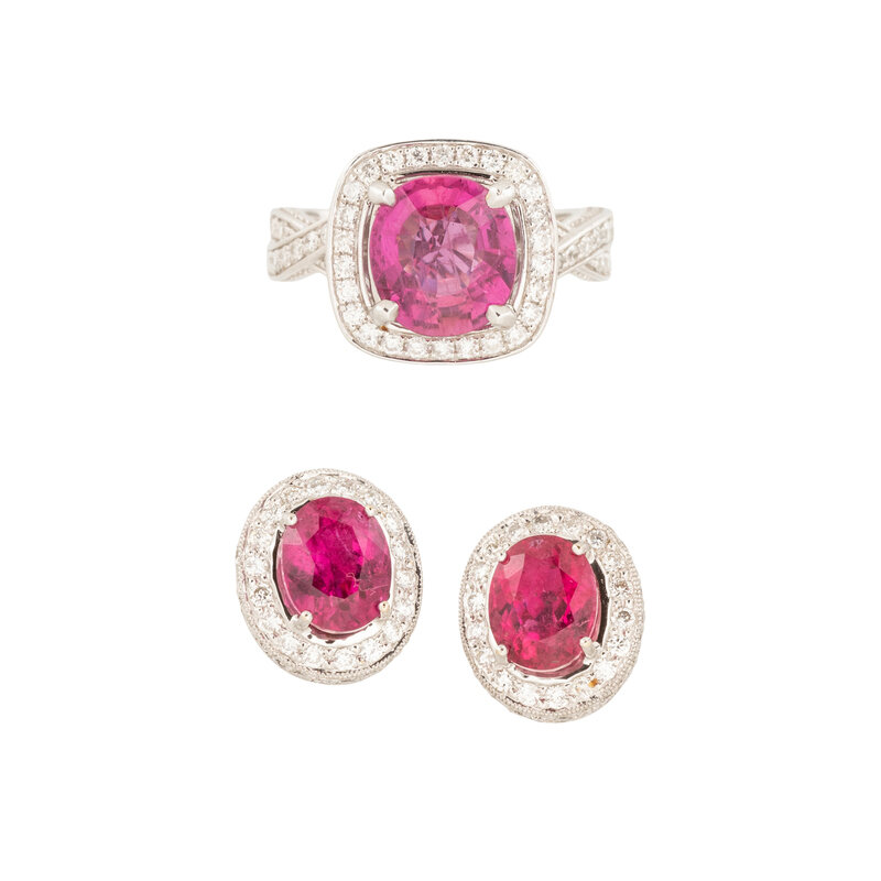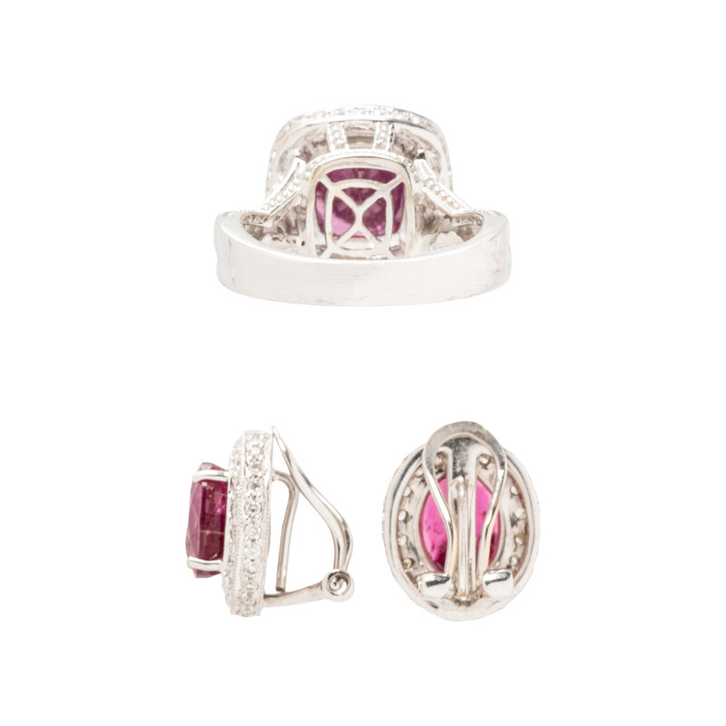 Consisting of a ring set with one cushion cut pink sapphire measuring approximately 9.60 x 8.80 mm and round brilliant cut diamonds weighing approximately 0.94 carat total, and a pair of clip earrings set with oval faceted cut pink tourmalines measuring approximately 8.55 x 6.85 mm and round brilliant cut diamonds weighing approximately 0.65 carat total. 14 karat and 18 karat white gold. Earrings: 9/16 inch long. Ring size: 6 1/2.