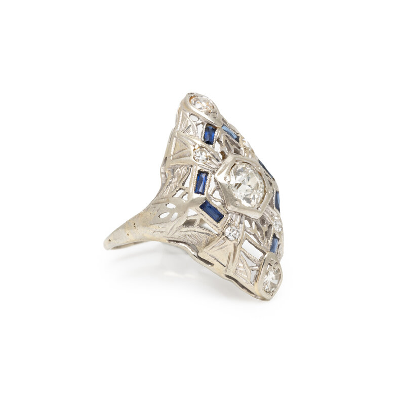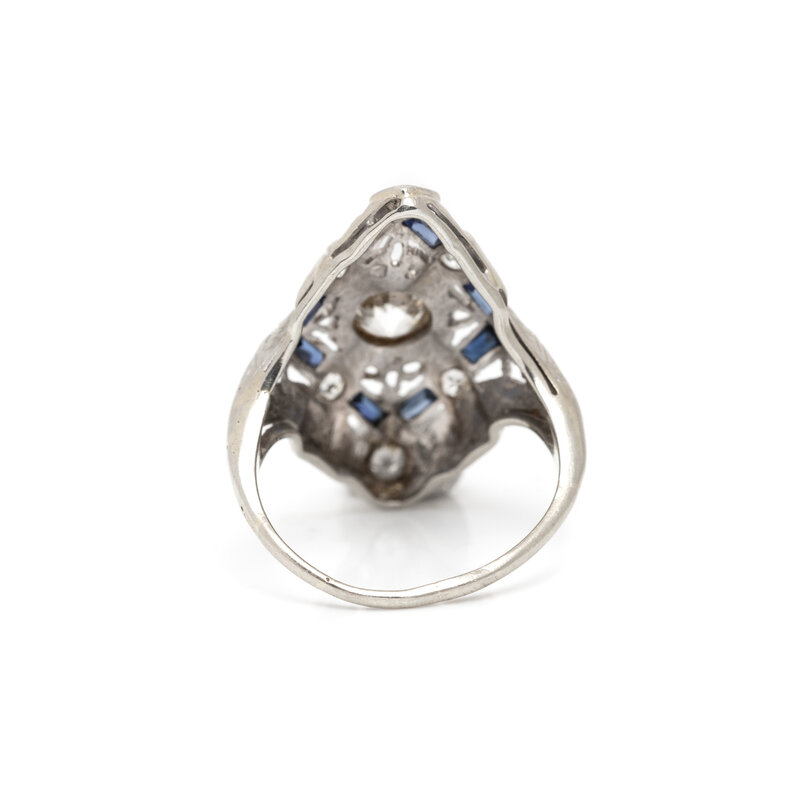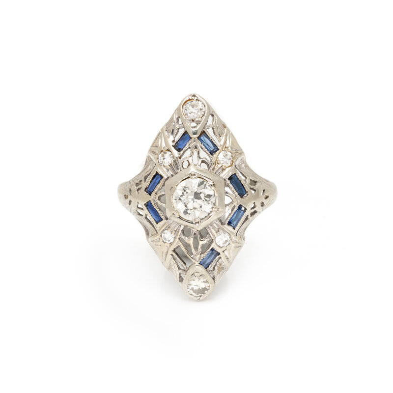 Centering an old European cut diamond weighing approximately 0.40 carat total, with French cut blue stone accents and single, old European, and transitional cut diamond accents. White gold. Ring size 5.