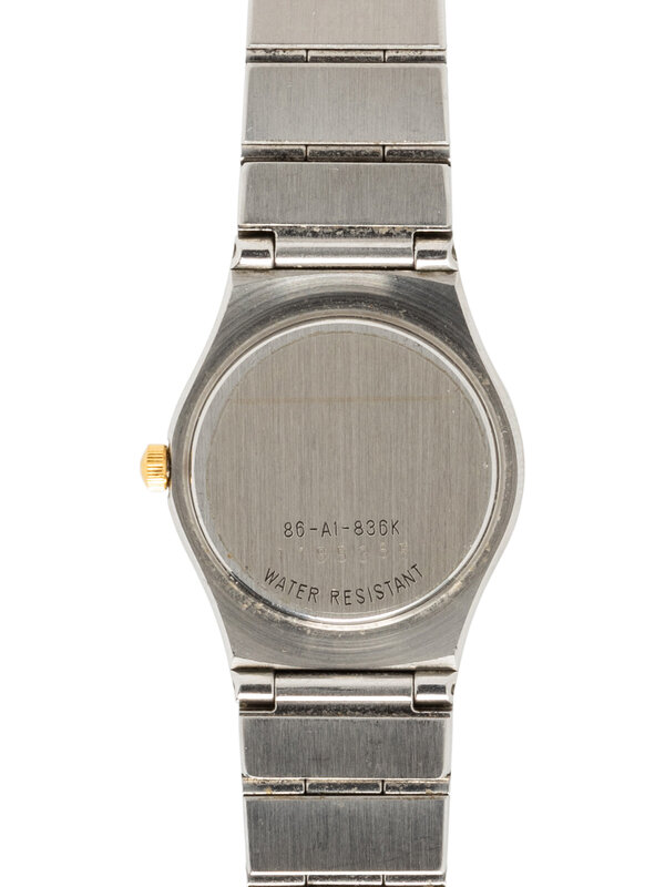 Stamps: Case back: 86-A1-836K 1185365 WATER RESISTANT. Clasp: STAINLESS STEEL V81M.