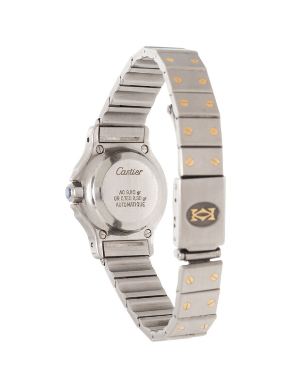 Stamps: Case back: Cartier AG 9.80 gr OR 0.750 2.30 gr AUTOMATIQUE. Bracelet stamp: Cartier.