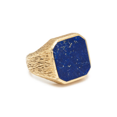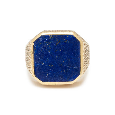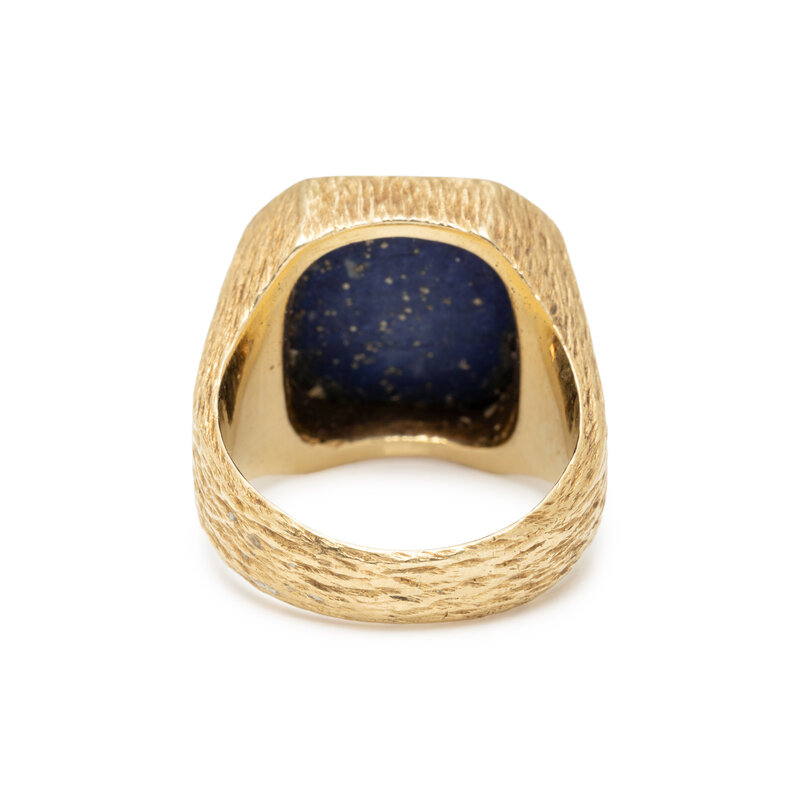 Lapis lazuli measuring approximately 14.55 x 14.50 x 2.05 mm. 18 karat yellow gold. Ring size 7.