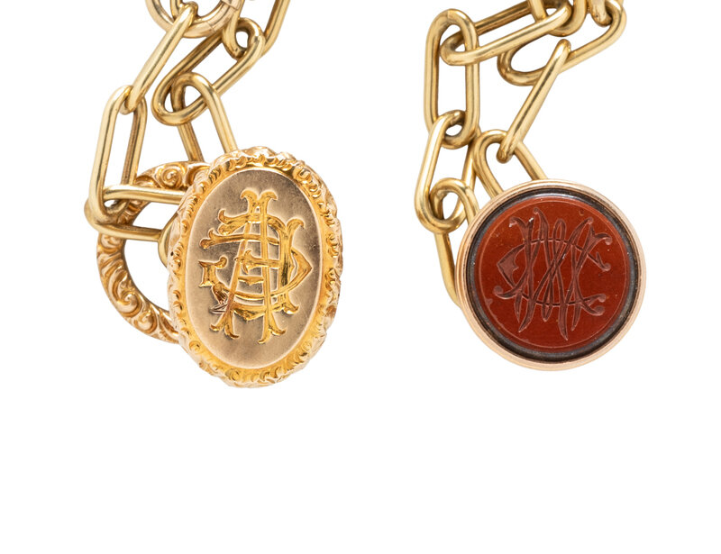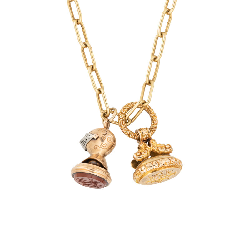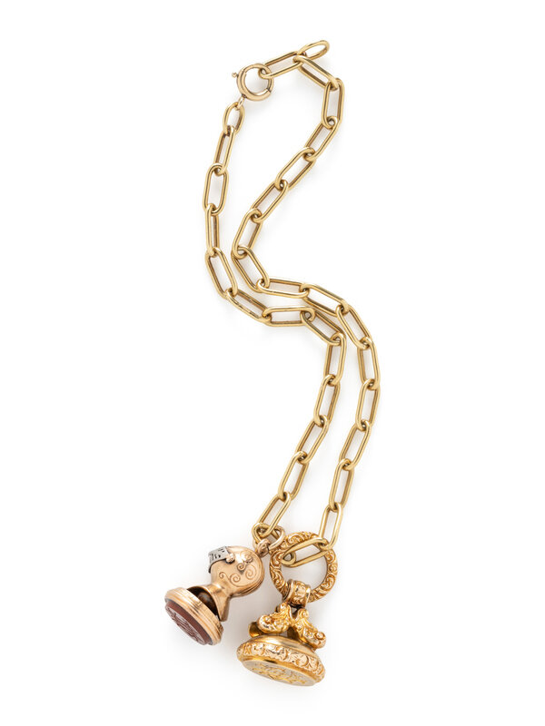 Including a yellow gold paperclip chain and two watch fobs. Yellow, rose, and white gold and platinum. Chain: 14 inches long. Knight fob: 1 3/8 inches long. Gold fob: 1 1/2 inches long.