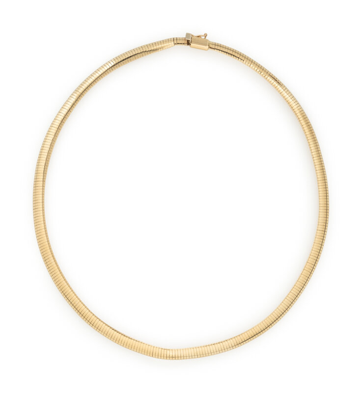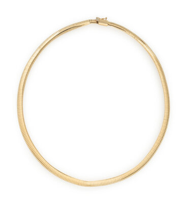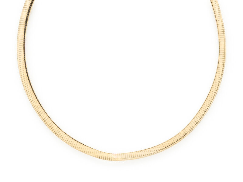 Omega link measuring approximately 6.00 mm. 14 karat yellow gold. 16 inches long.