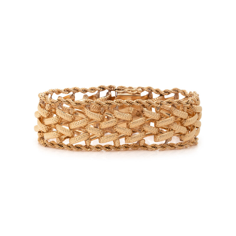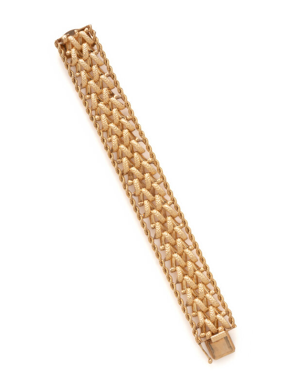 Fancy links measuring approximately 24.00 mm wide. 14 karat yellow gold. 7 1/4 inches long.
