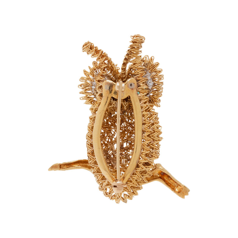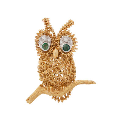 EMERALD AND DIAMOND OWL BROOCH