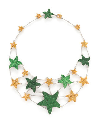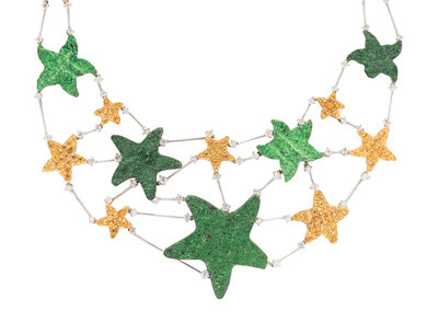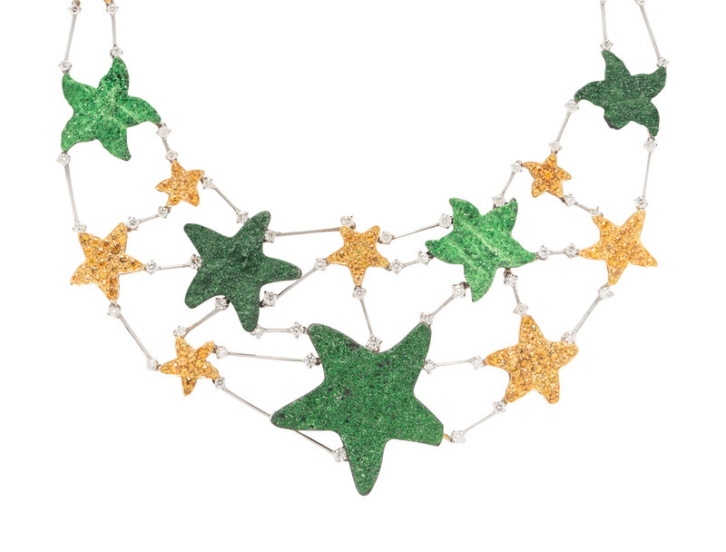 Green druzy quartz stars, round faceted yellow sapphires, and round brilliant cut diamonds weighing approximately 3.50 - 4.50 carats total. 18 karat yellow and white gold. 13 3/4 inches long.