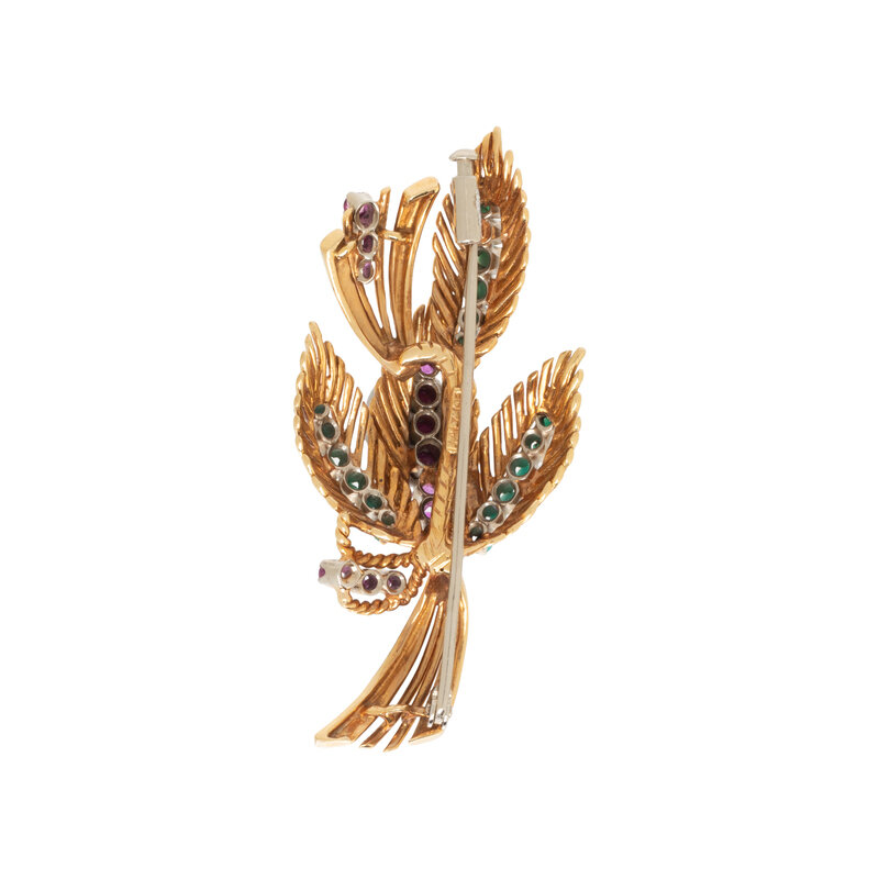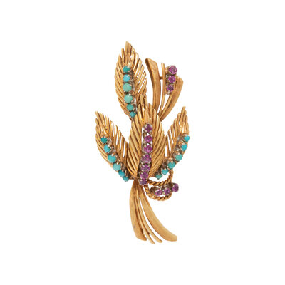 YELLOW GOLD, TURQUOISE, AND RUBY BROOCH
