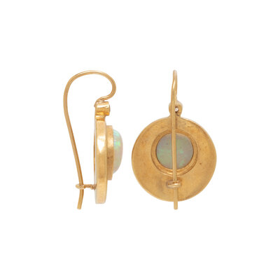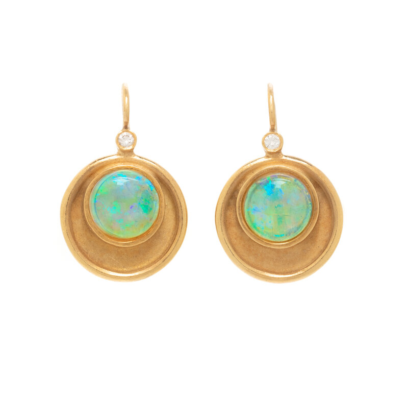 Round opals measuring approximately 10.00 x 10.00 mm and round brilliant cut diamonds. Yellow gold. 1 inch long.
