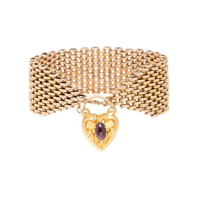 Oval cabochon garnet measuring approximately 9.00 x 5.00 mm. Yellow gold. Bracelet: 7 1/2 inches long, 1 inch wide. Charm: 3/4 inch wide.