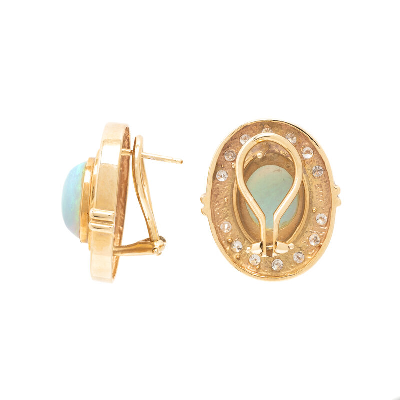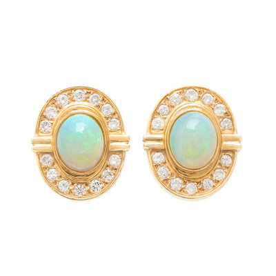 Oval cabochon opals measuring approximately 11.00 x 9.00 x 4.00 mm and round brilliant cut diamonds weighing approximately 1.65 carats total, posts with clip backs. 14 karat yellow gold. 7/8 inch long.