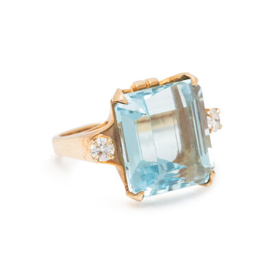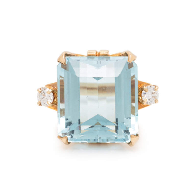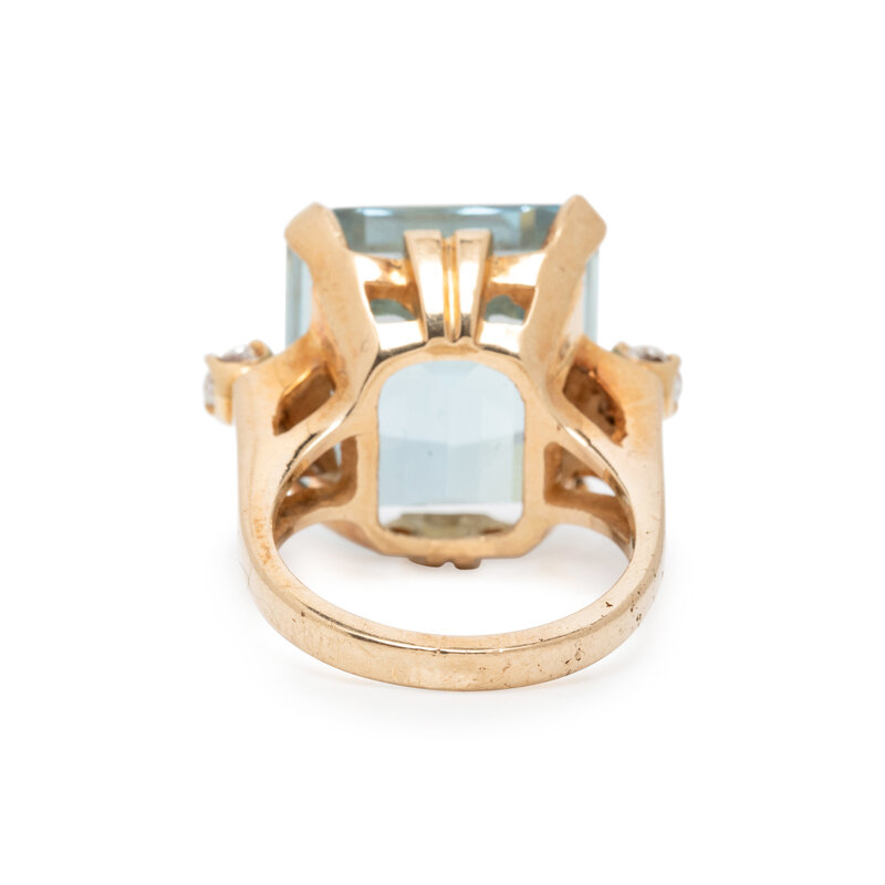 Emerald cut aquamarine measuring approximately 16.90 x 15.00 x 10.80 mm and round brilliant cut diamonds. 14 karat yellow gold. Ring size 6.