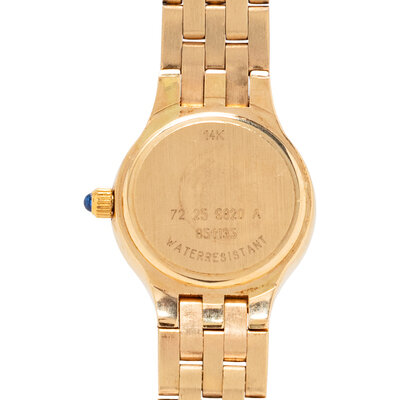 Stamps: Case back: 14K 72 25 9820 A 851135 WATERRESISTANT. Clasp: MADE IN ITALY 585 K97.