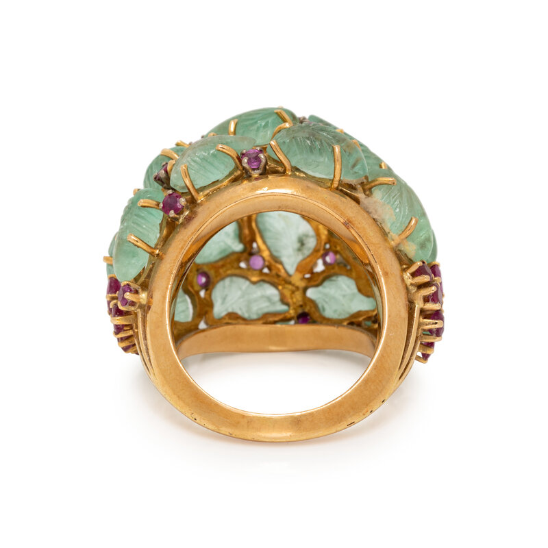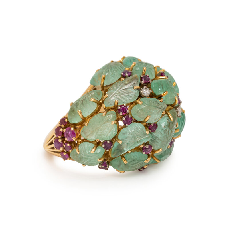 CARVED EMERALD, DIAMOND, AND RUBY RING