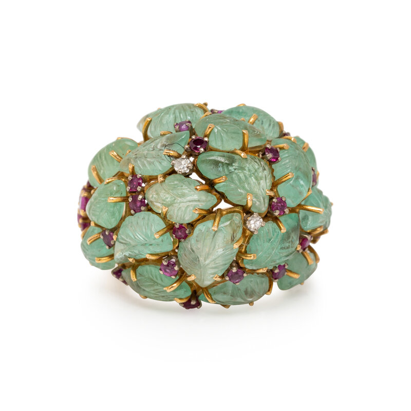 Variously sized carved emeralds with round faceted ruby and single cut diamond accents. Yellow gold. Ring size 7.