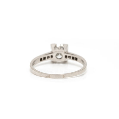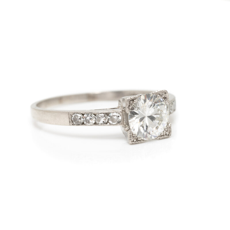 Transitional cut diamond weighing approximately 0.71 carat with single cut diamond accents. Platinum. Ring size 6 3/4.