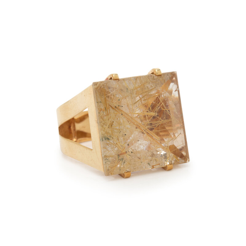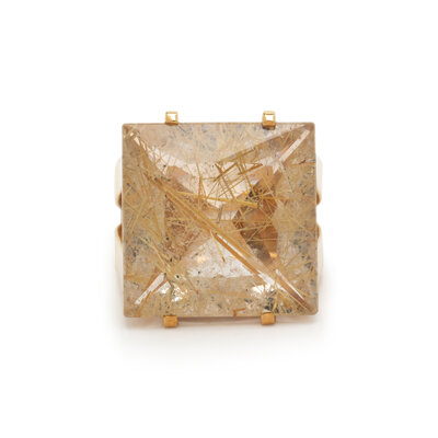 Square mixed cut rutilated quartz measuring approximately 20.00 x 20.00 x 10.00 mm. Yellow gold. Ring size 9.