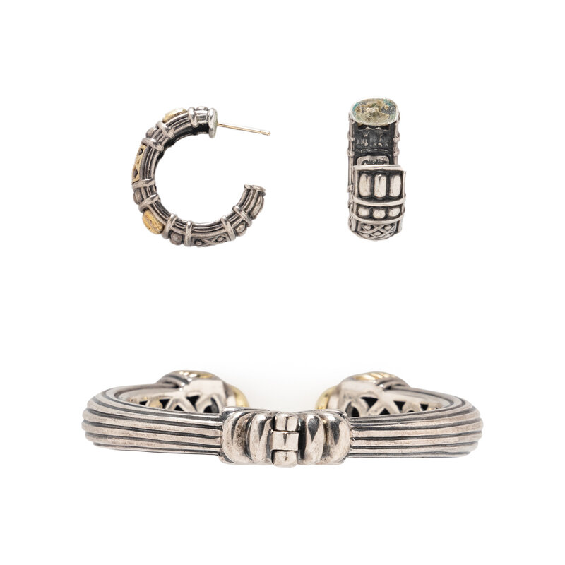 Including a necklace, earrings, and cuff bracelet, hinged at the back. Sterling silver and 18 karat yellow gold. Necklace: 15 1/2 inches long. Bracelet: 6 1/4 inches inner circumference. Earrings: 1 inch long.