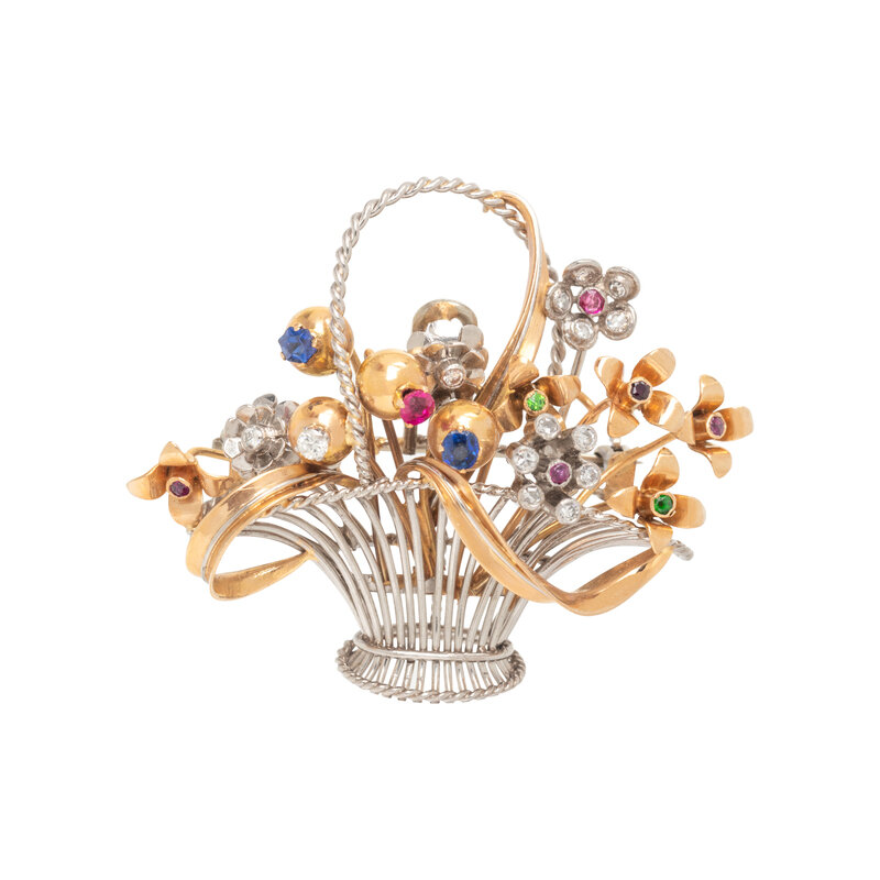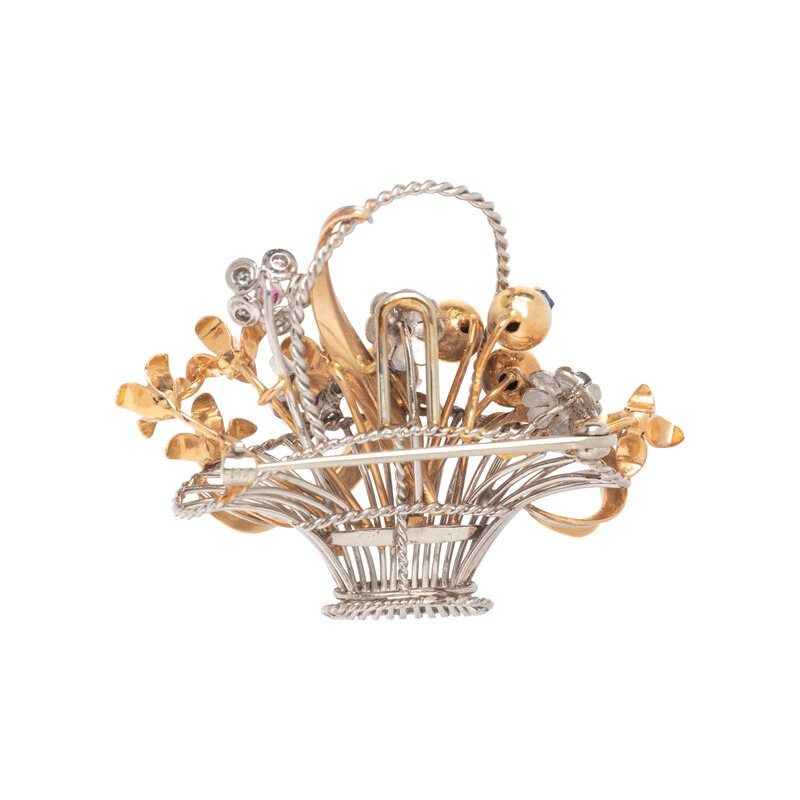 Demantoid garnet, synthetic ruby, synthetic sapphire, and single and round brilliant cut diamonds. Platinum and yellow gold. 1 1/2 x 2 inches.