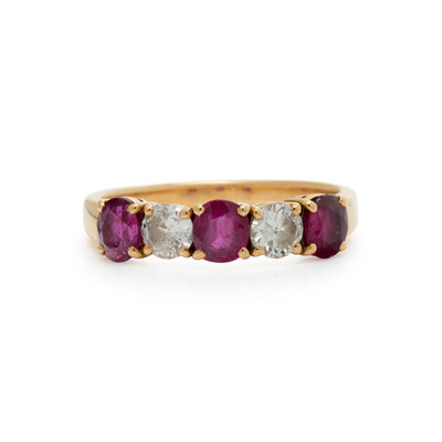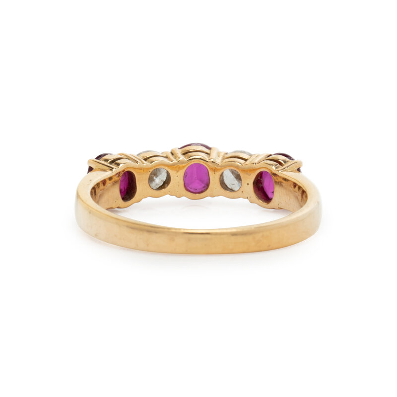 Round and oval faceted rubies and round brilliant cut diamonds weighing approximately 0.58 carat total. 18 karat yellow gold. Ring size 8 3/4.