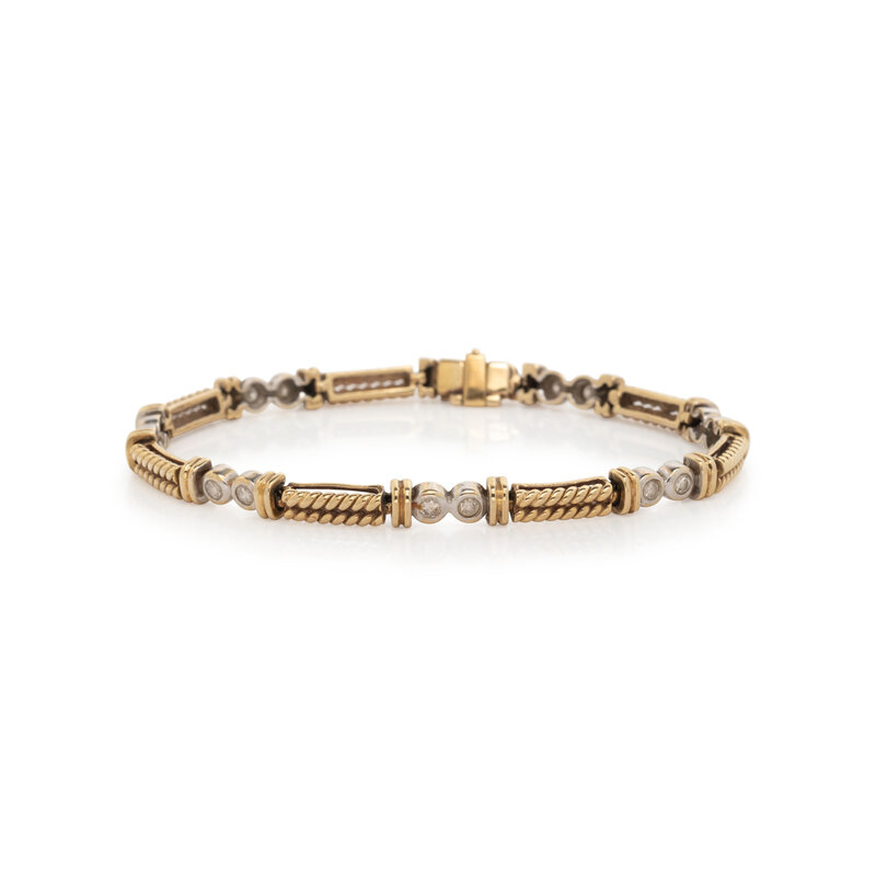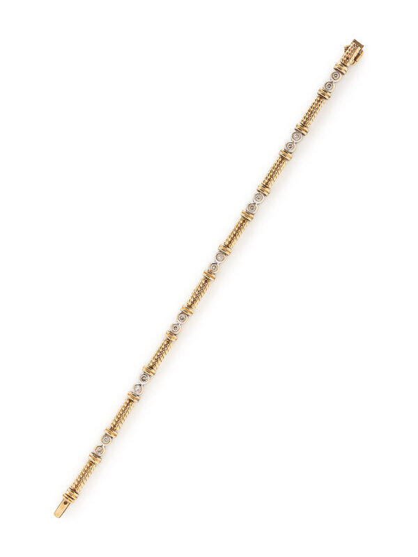 Round brilliant cut diamonds. Yellow and white gold. 6 3/4 inches long.