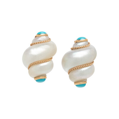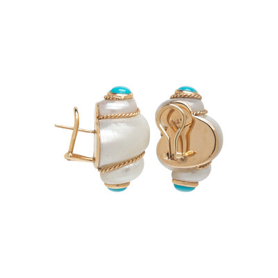 Shell and round cabochon turquoise, posts with clip backs. 14 karat yellow gold. 1 1/8 inches long.