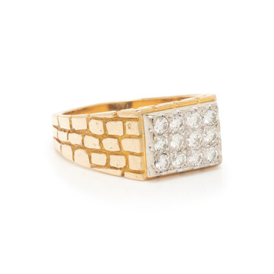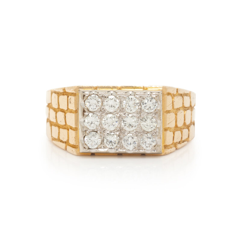 Round brilliant cut diamonds weighing approximately 0.60 carat total. 14 karat yellow and white gold. Ring size 13 1/2.