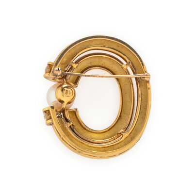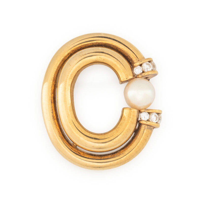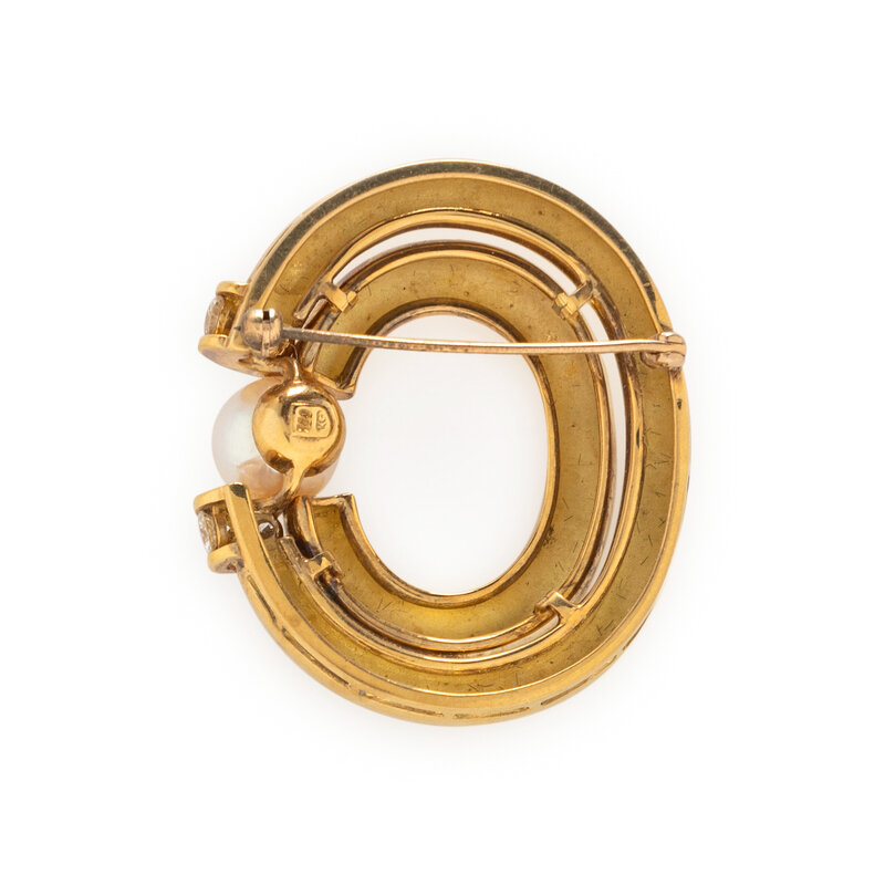 YELLOW GOLD, CULTURED PEARL, AND DIAMOND BROOCH
