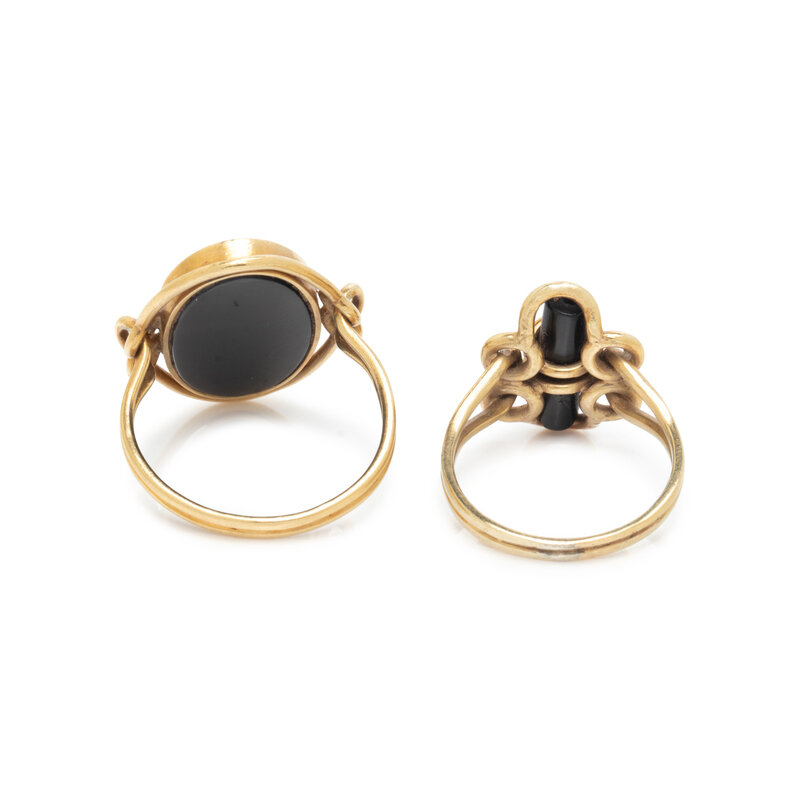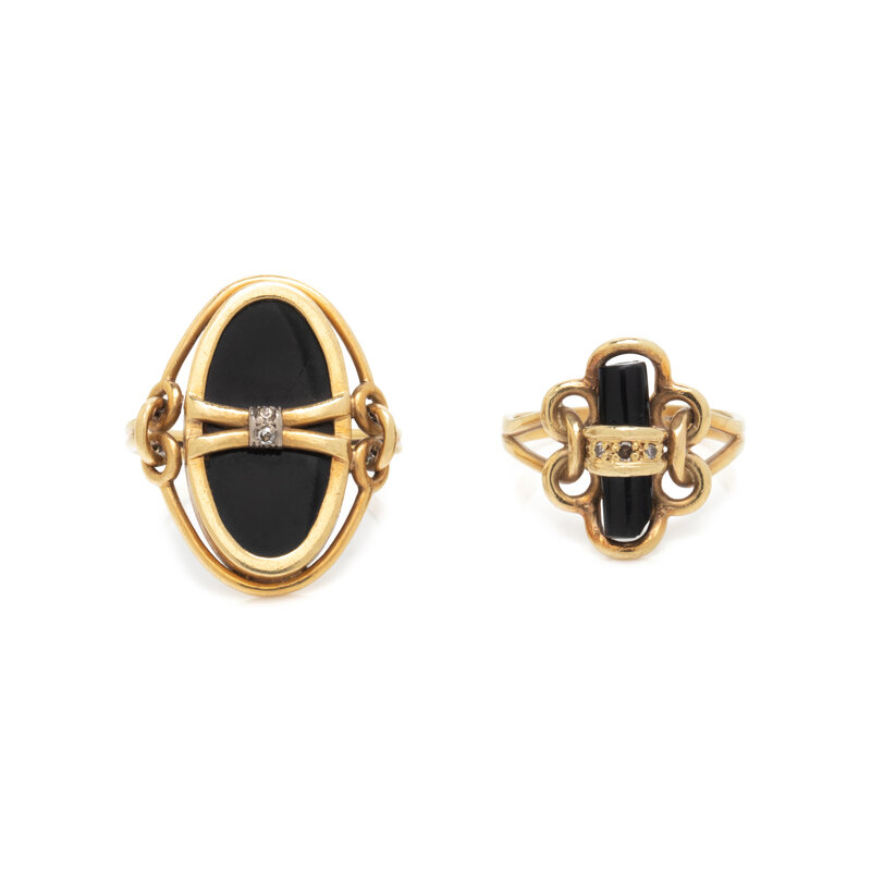 One set with a black onyx bar and three single cut diamonds, the other set with oval cut black onyx and two single cut diamonds. Yellow gold. Ring sizes 6 and 7 3/4.