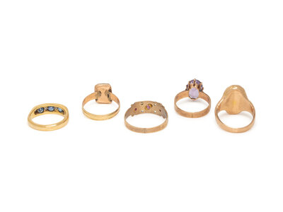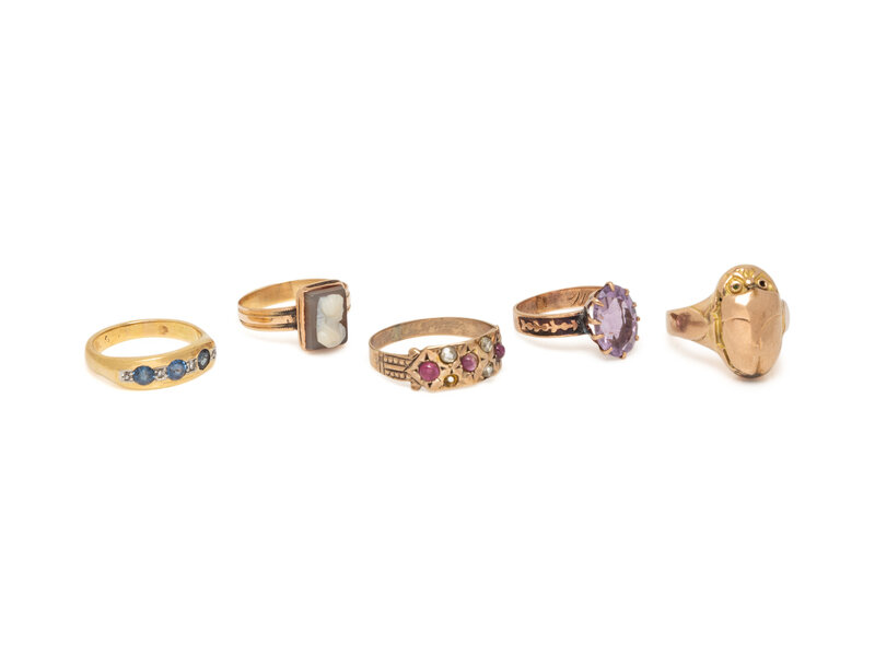 One set with oval faceted amethyst, one designed as a scarab with a green stone eye, one set with a rectangular cameo, one set with round faceted sapphires and single cut diamonds, and one set with round cabochon rubies and single cut diamonds. Yellow and rose gold. Ring sizes 4, 4 3/4, 5 1/2, 4 1/4, 7 3/4.