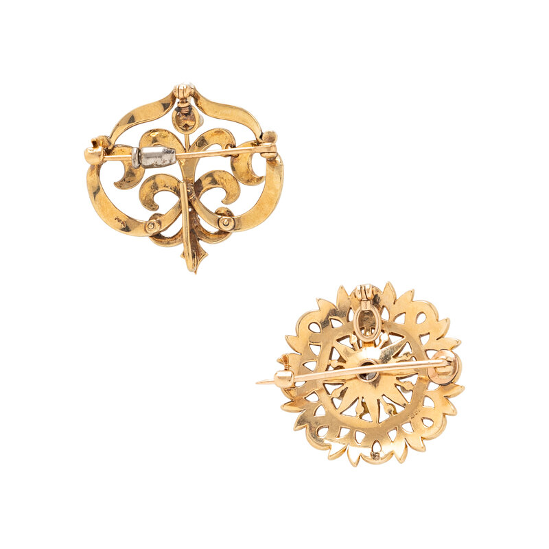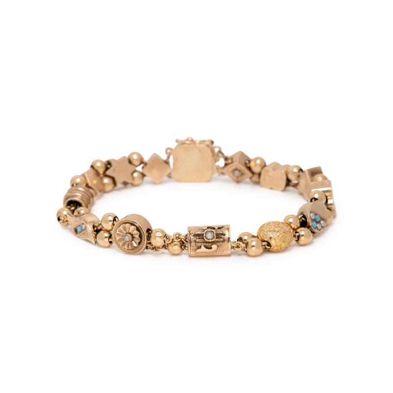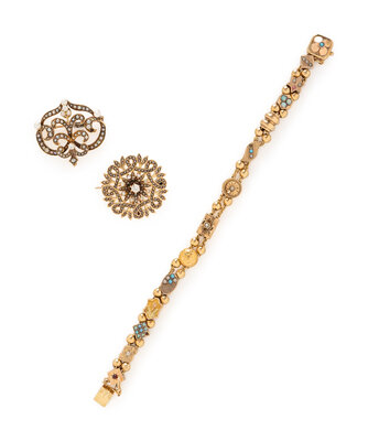 Including a slide charm bracelet variously set with colored stones, a brooch/pendant set with an old European cut diamond and seed pearls, and a brooch/pendant set with an old mine cut diamond and seed pearls. 14 karat yellow gold. Bracelet: 6 3/4 inches long. Brooches: 1 1/8 inches wide and 1 3/16 x 1 3/16 inches.