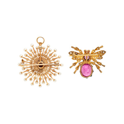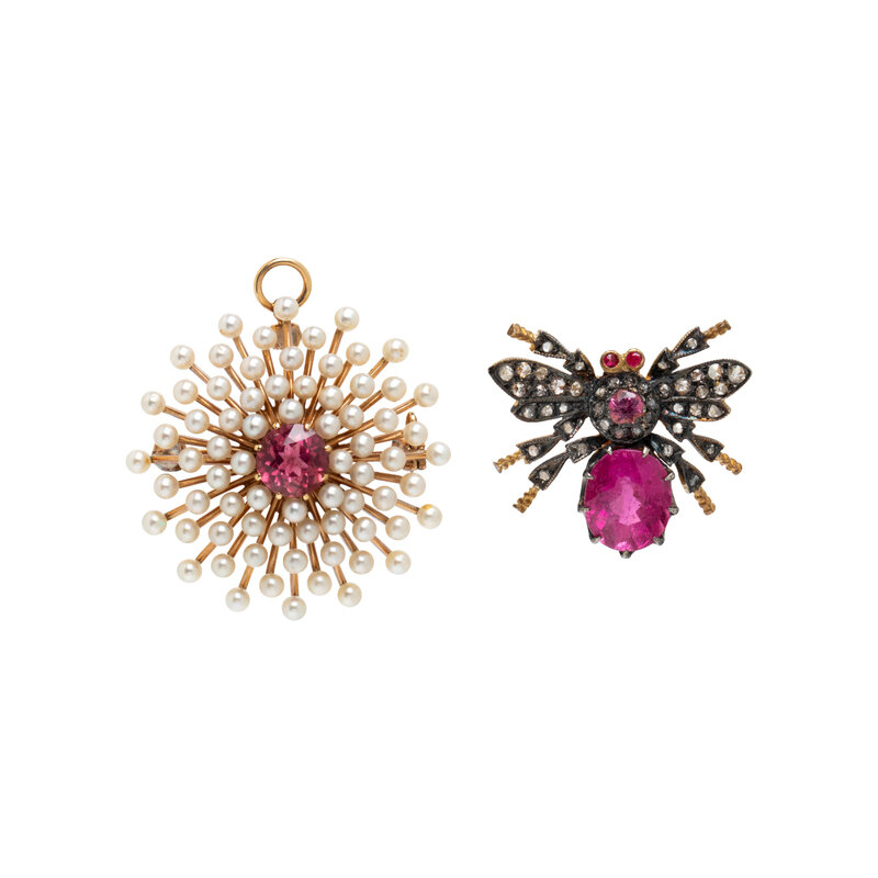 One brooch/pendant set with a round faceted pink tourmaline and seed pearls, the other designed as an insect set with round and oval faceted pink tourmaline and rose cut diamonds. 14 karat yellow gold and silver-topped gold. 1 1/4 x 1 1/8 inches and 7/8 x 7/8 inches.