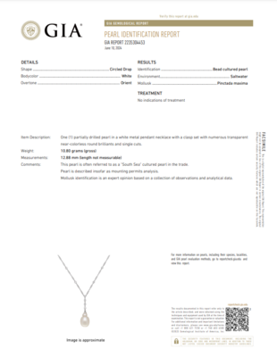 GIA, 2024, Report No. 2235304453, Circled Drop shape, White bodycolor, Orient overtone, Bead cultured pearl, Saltwater, Pinctada maxima. No indications of treatment.